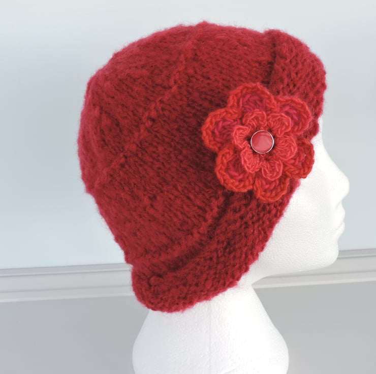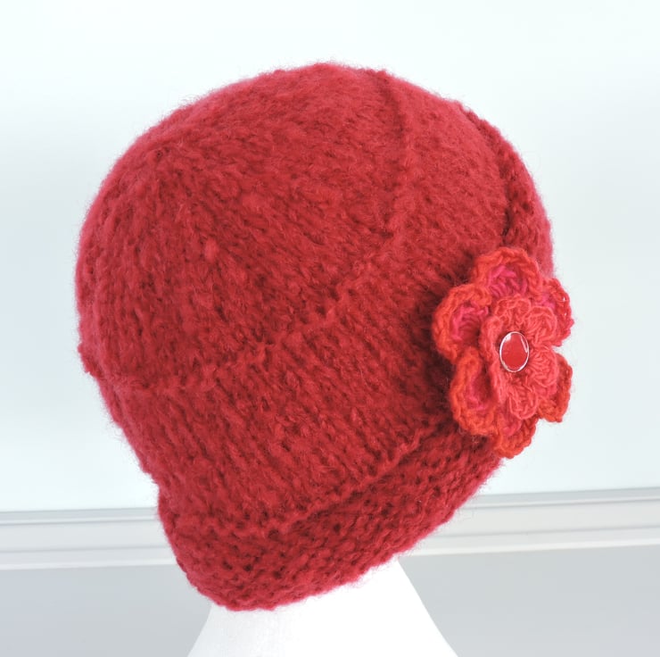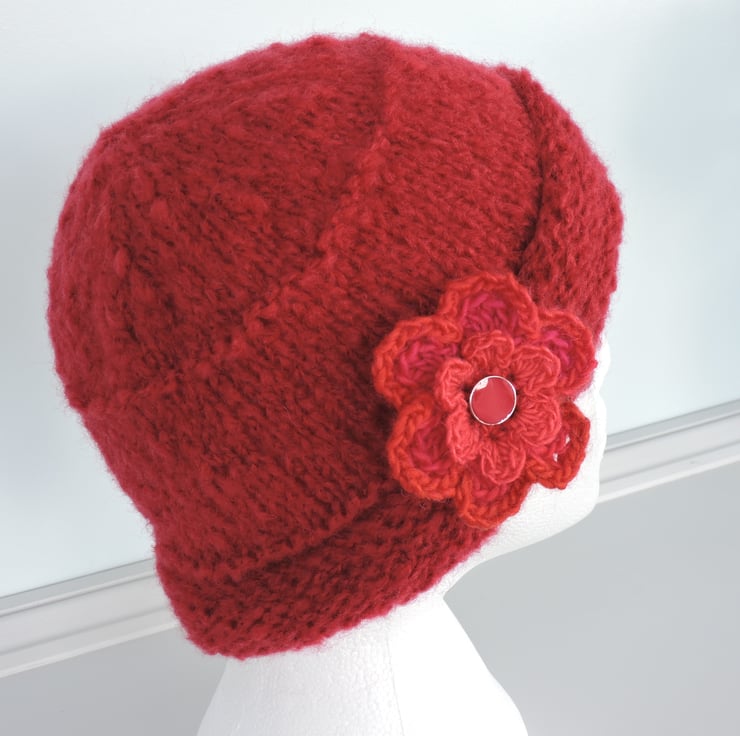 I've knitted this adults beanie hat in a chunky brushed red acrylic and wool yarn. It is finished with a removable double layer crochet flower brooch with central button and a safety brooch pin on the back.