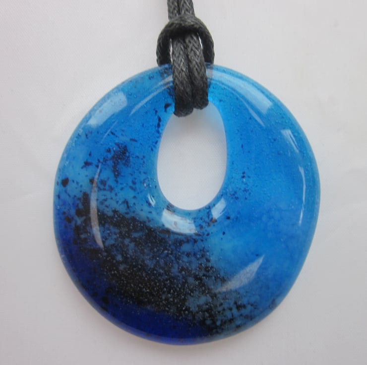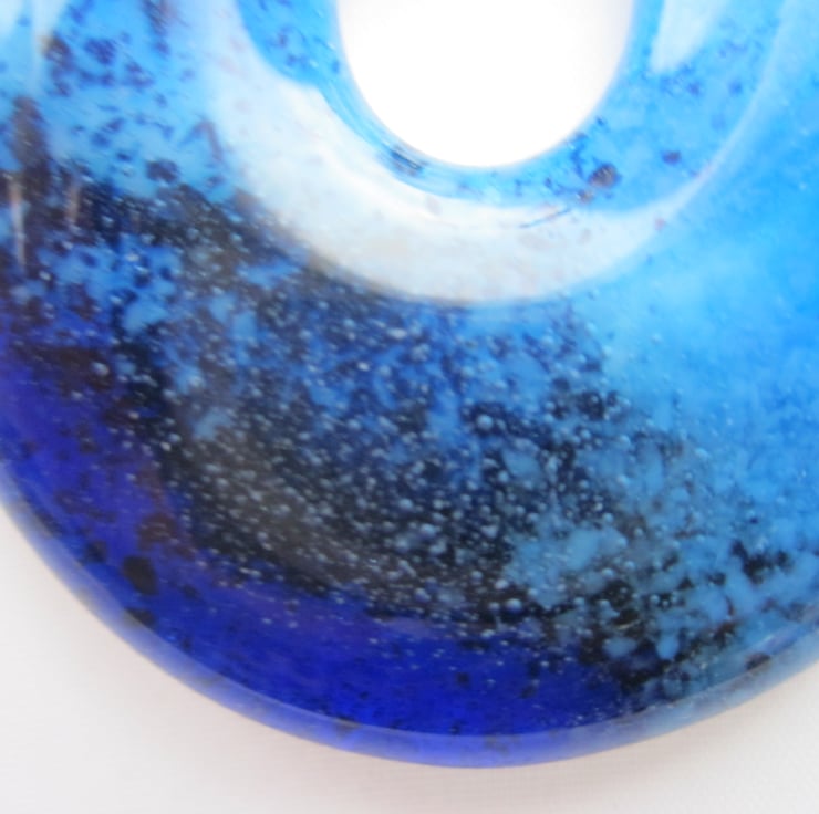 It is a stunning ornament, with turquoise and royal blue frit cast with dark blue aventurine, encased in clear glass. A beautiful piece of statement jewellery and one of a kind. Ideal as a present to a loved one.