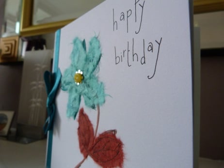 This is completely handmade and uniquely designed card. Consisting of a flower and stem hand drawn in black ink and hand coloured on pristine white quality card. The petals and leaves have been emphasised with co-ordinating mulberry papers in turquoise and burnt orange. The centre of the flower has been embellished with sequin and yellow button. There is a row 3 co-ordinating buttons in the bottom right. Happy birthday has been hand written in black ink. Finished off with turquoise satin ribbon and bow