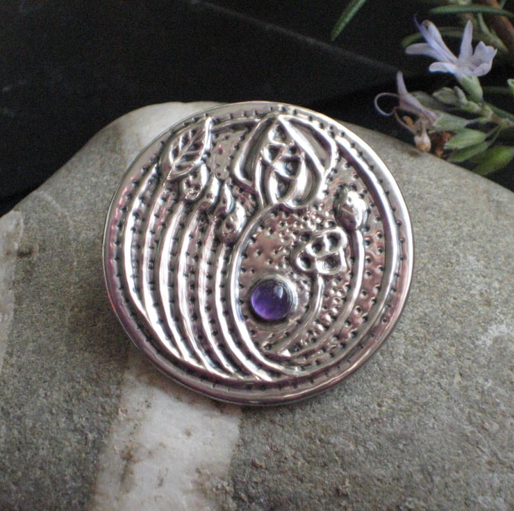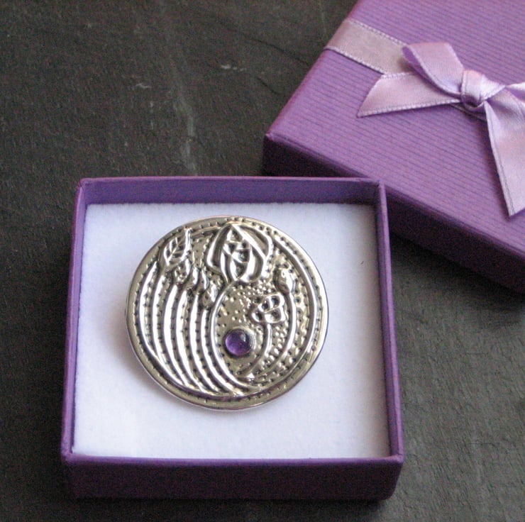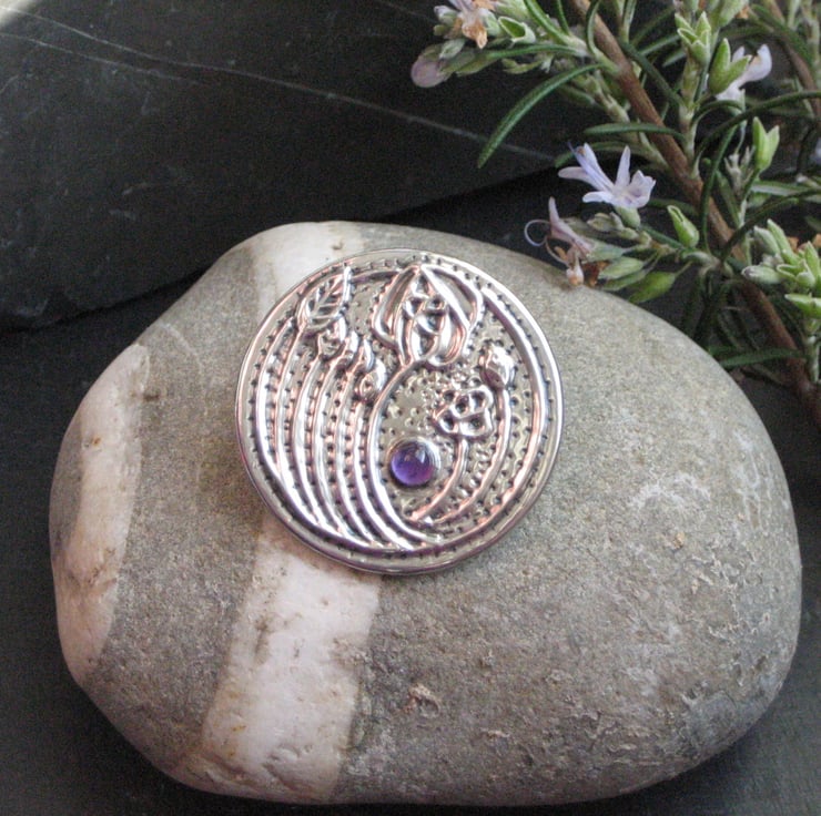 Handmade Mackintosh rose design brooch in pewter. Inspired by the work of Charles Rennie Mackintosh, I have made this brooch in shiny lead-free sheet pewter using the repousse method. Measuring 37mm across, the brooch is set with a genuine amethyst cabochon and has a 30mm pin with safety catch on the reverse. It is light in weight so wearable with a variety of fabrics and will be sent in and attractive gift box. A fantastic gift for a 10th Wedding Anniversary (pewter) or February Birthday (amethyst) or a special present for Mothers' Day.