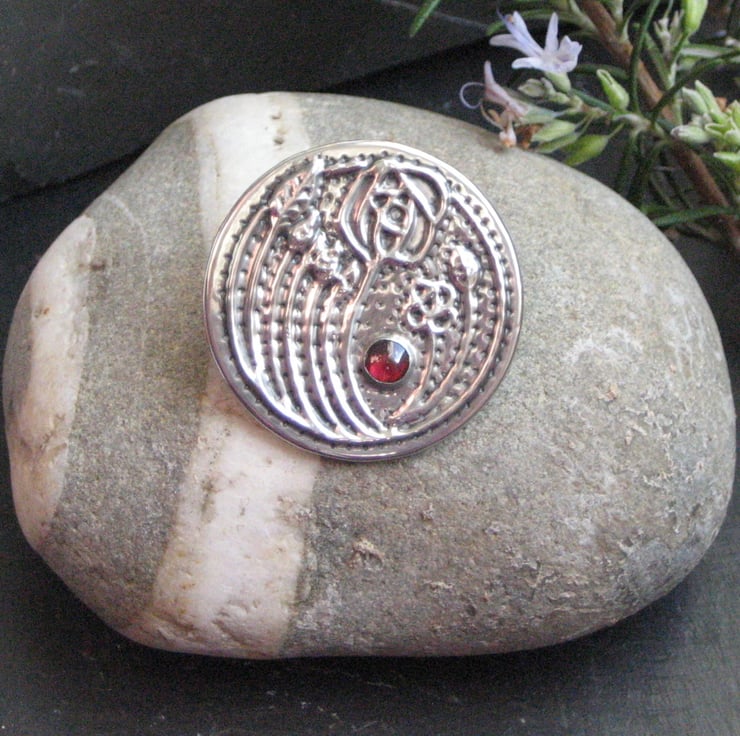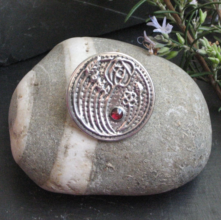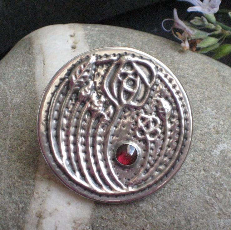Mackintosh rose design brooch hand crafted with garnet. This striking brooch, inspired by the designs of Charles Rennie Mackintosh, has been handmade from pewter in the Arts and Crafts tradition. The lead-free metal has been oxidised then polished to a deep shine. Set with a genuine rich red garnet, the brooch is lightweight for versatility of wear. Gift-boxed for giving as a present for a Birthday, Anniversary, Mother's Day or many other special occasions. It measures 37mm in diameter.