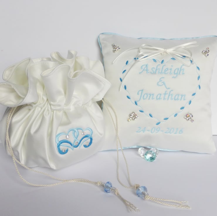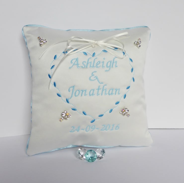 The cushion is personalised with 2 names embroidered inside a heart, and the wedding date under the heart. Narrow matching ribbon decorates the outside edge of the cushion.