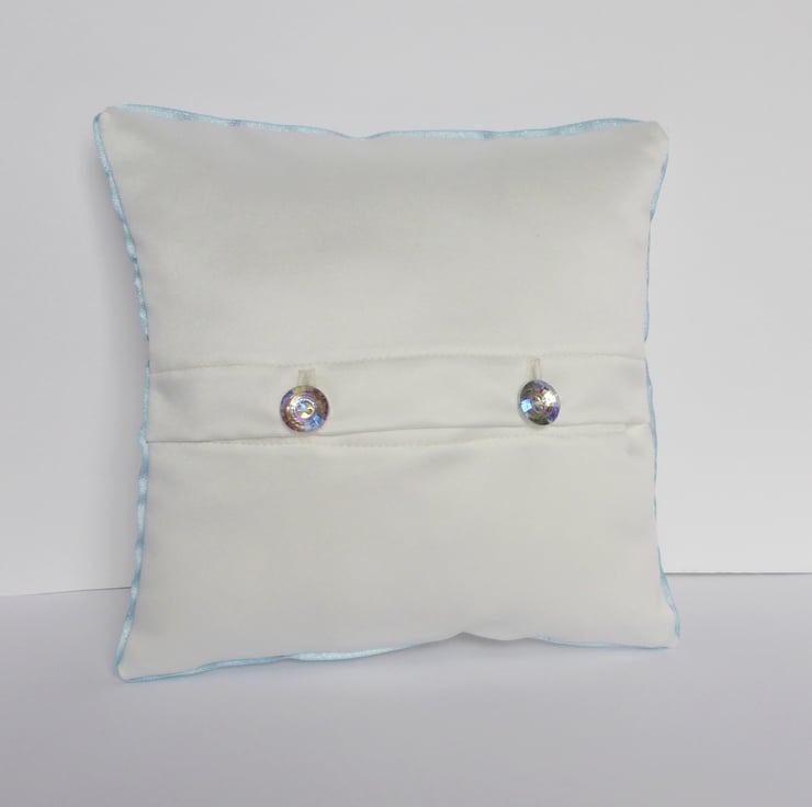 The back of the cushion closes with 2 crystal effect buttons and is approximately 8” square (20cm).
