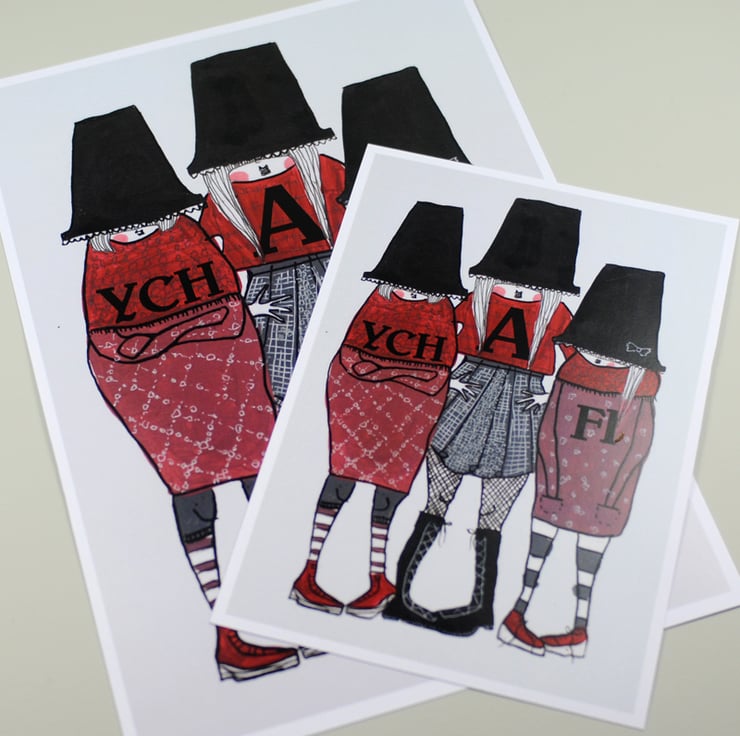 YCH A FI! These Welsh ladies are full of attitude. This print features three of Twinkle & Gloom's alternative Welsh ladies. As you will see in image two, this print is also available in a larger size.