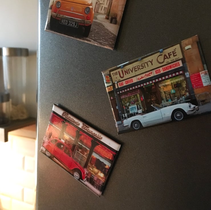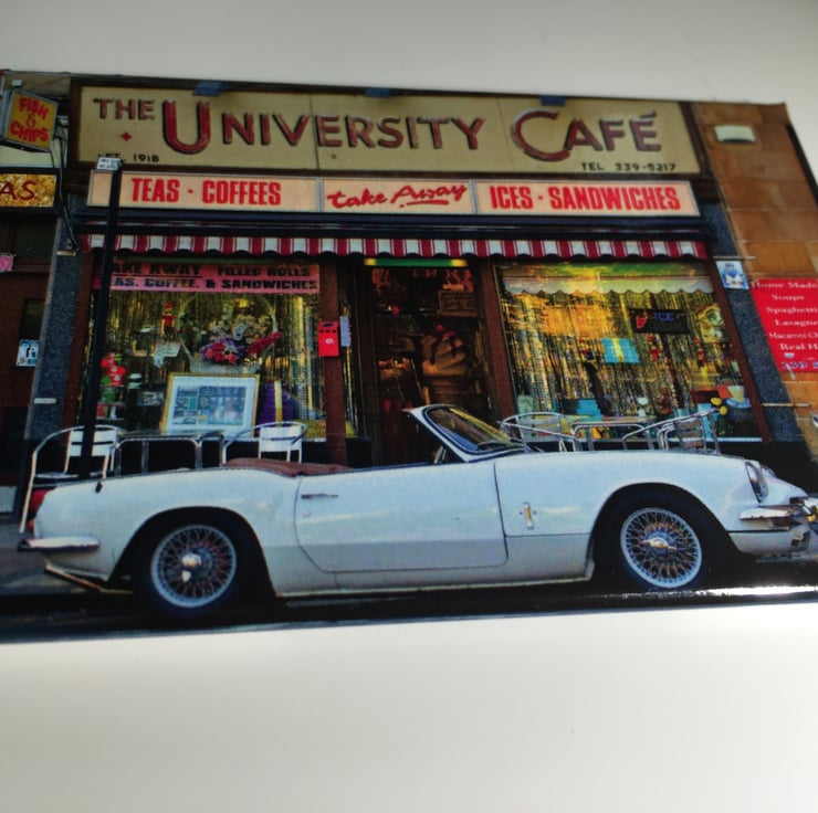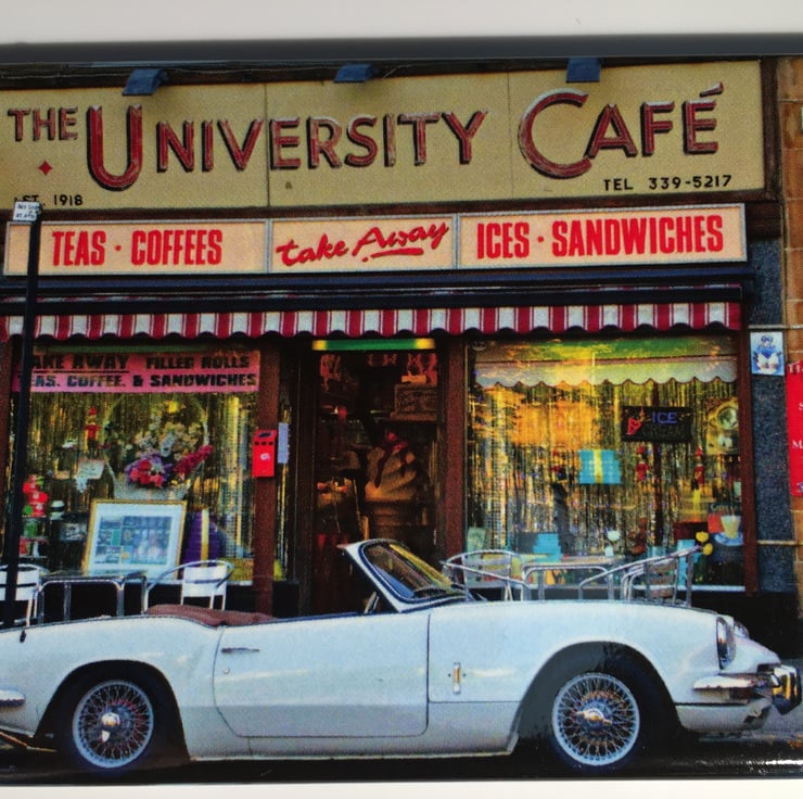 High quality fridge magnet featuring original photo of a classic Triumph Spitfire outside the famous University Cafe on Byres Rd in Glasgow