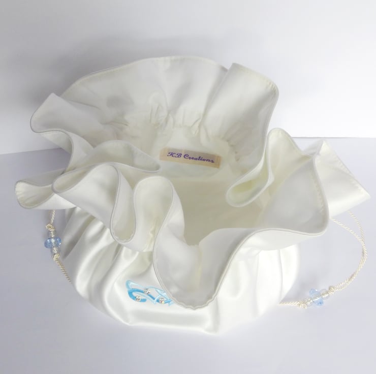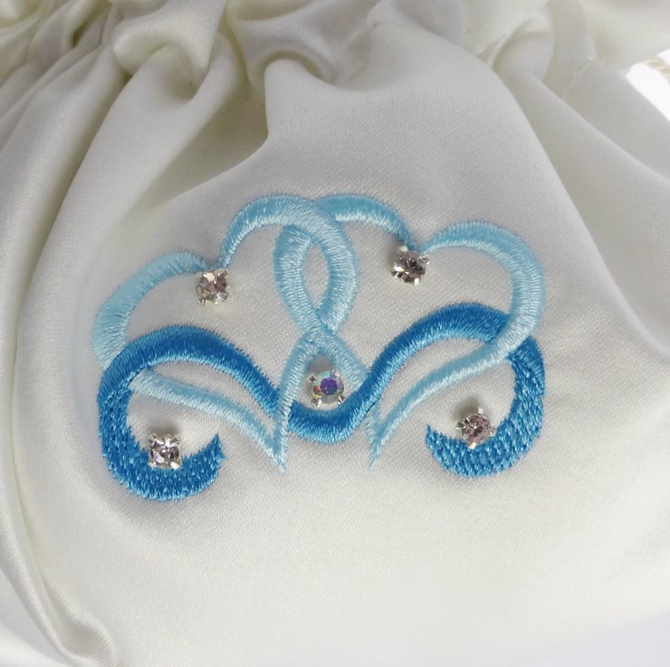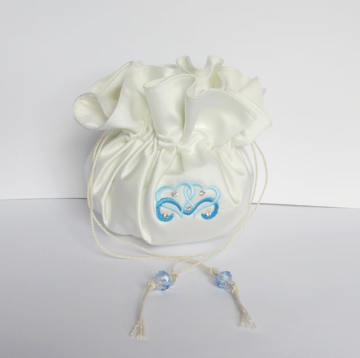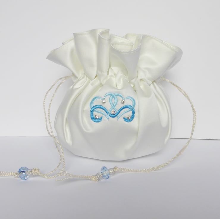 This is a lovely bridal dolly bag made using a complete circle of duchess satin, with twin hearts embroidered on the front, and with diamanté accents sewn on.