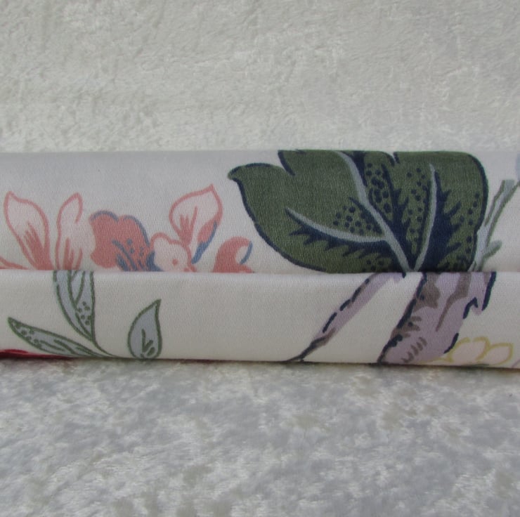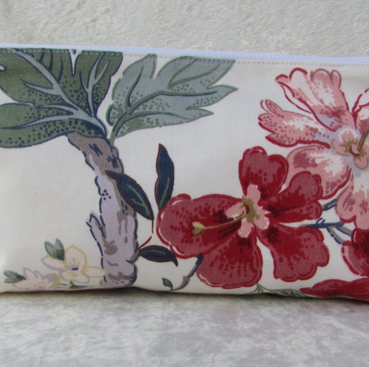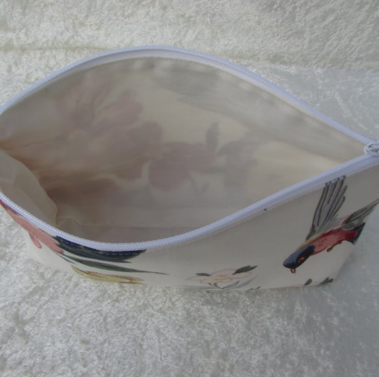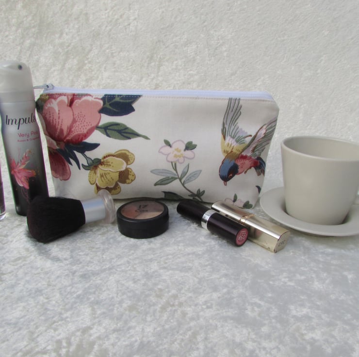 A cream zipped cosmetic bag with a vintage-style floral and bird print pattern in shades of pink, blue, green and gold. The bag is fully lined with cream fabric and has a boxed base to give plenty of storage space for all those essential items.