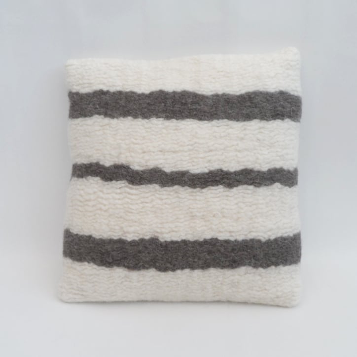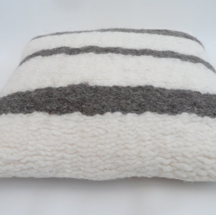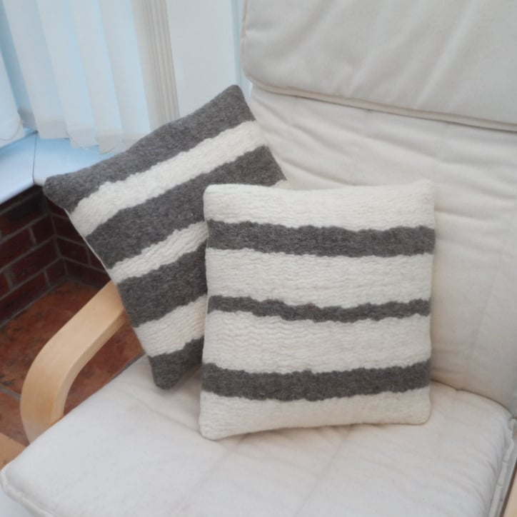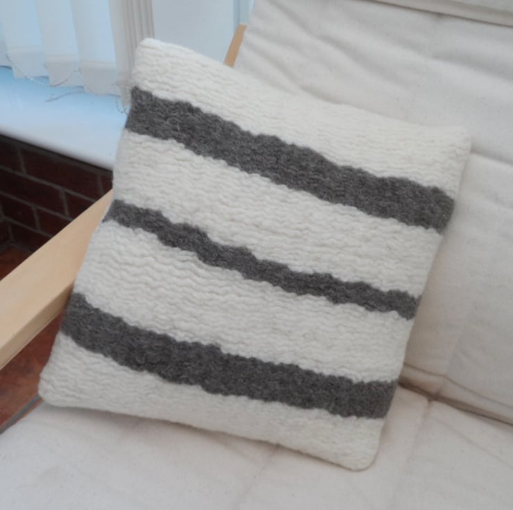 Hand woven on a peg loom using 100% natural white and grey Jacob wool, the front cover of this cushion has then been lightly felted to produce a robust, textured finish. It has been securely stitched using double stitching to a cream cotton calico back cover which has a velcro opening. The cushion cover measures approximately 38cm x 38cm (15" x 15") and comes complete with a standard size 40cm x 40cm (16" x 16") inner cushion pad. The use of a slightly larger cushion pad results in a plump cushion which is snug and warm to cuddle up to.