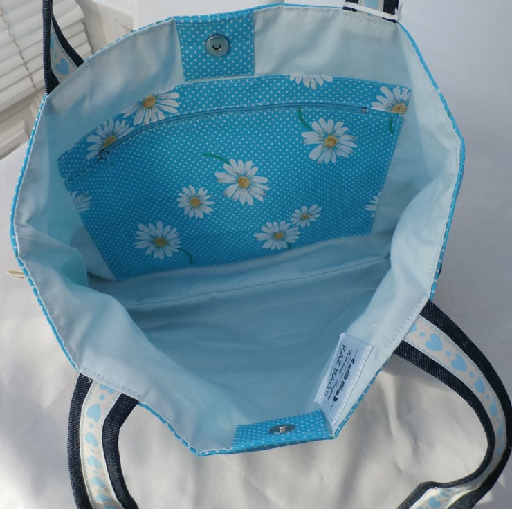 the inside is lined in a light blue cotton fabric with a large zipped pocket in the same daisy print fabric .