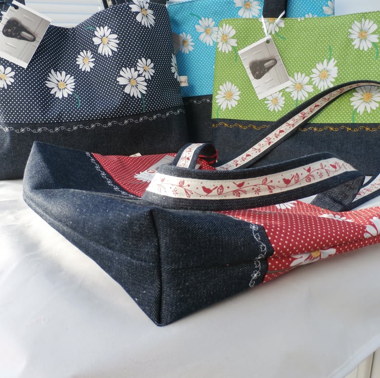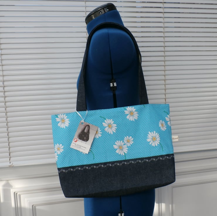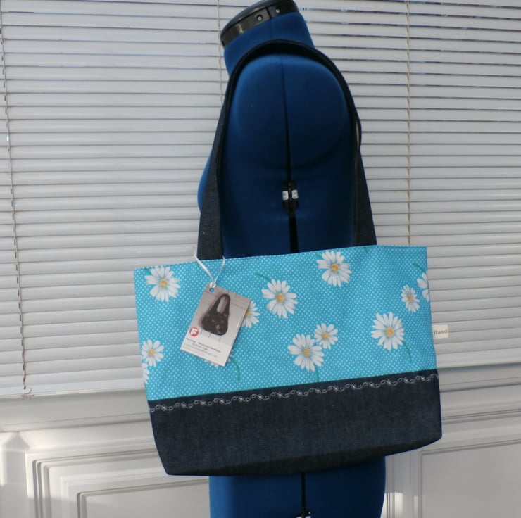 Tote bag in a turquoise blue with white polka dots and daisy flowers , handles and base in dark blue denim .