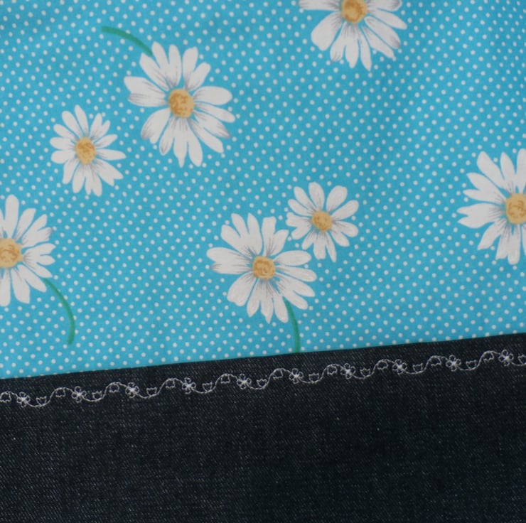 Decorative stitched flowers in white a long the denim seam all other seams top stitched.