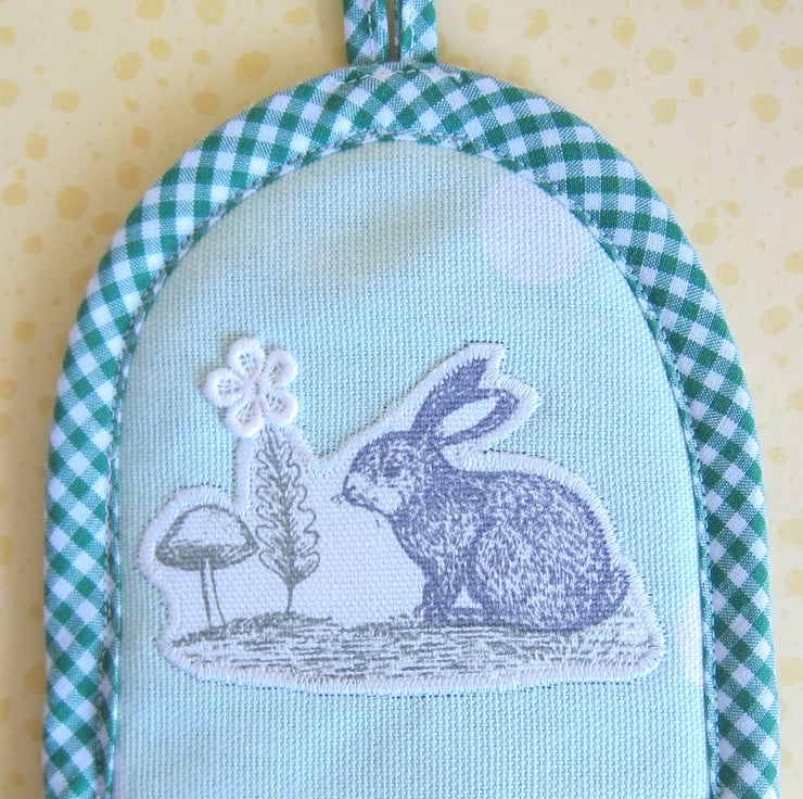 Pale green and white spot egg cosy with an appliqued rabbit and lace flower embellishment. Lined with soft grey fleece and edged in green gingham. It measures 13 x 11.5 cm (not including hanging loop).