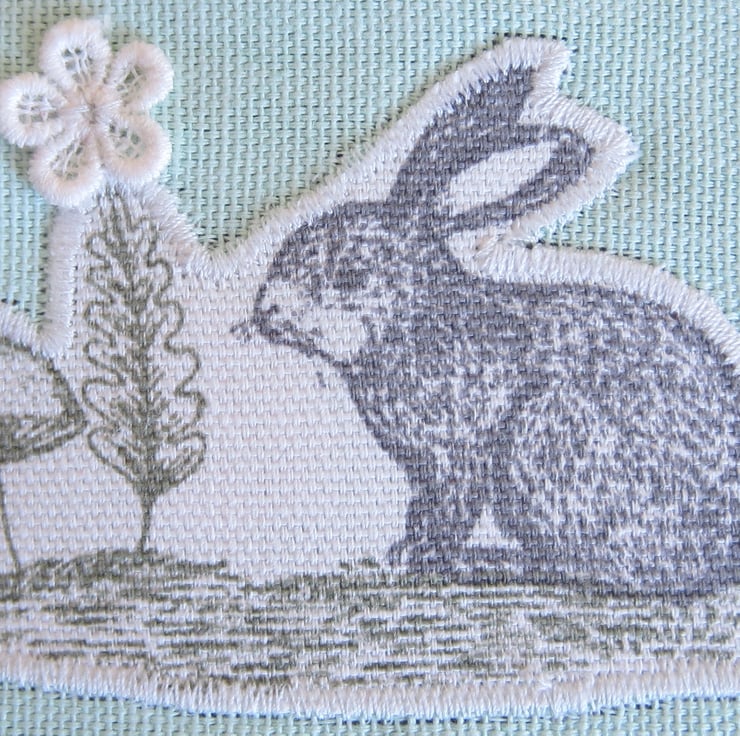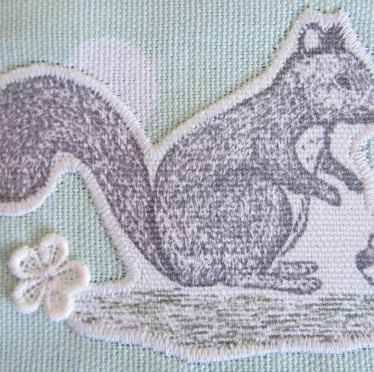 Pair of pale green and white spot egg cosies. One with an appliqued squirrel and lace daisy embellishment, the other with an appliqued bunny rabbit and lace daisy embellishment. They are lined with soft grey fleece and edged in green gingham and measure 13 x 11.5 cm (not including hanging loop).