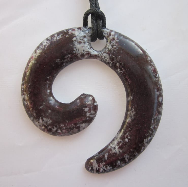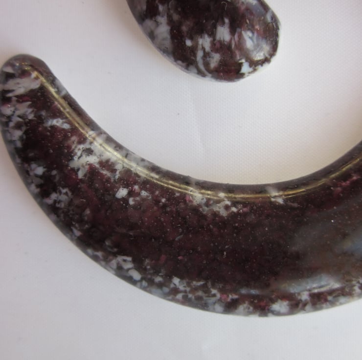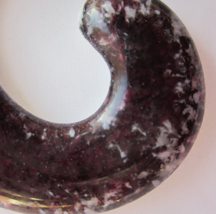 This glass cabochon was fused by me. It was cast in a mould and then the glass was heated up to around 790 degrees celsius in a small glass fusing kiln and then it was then brought to annealing temperature to make it strong. It was then fire polished in the kiln to create the smooth surface. This whole process takes over 17 hours to complete.
