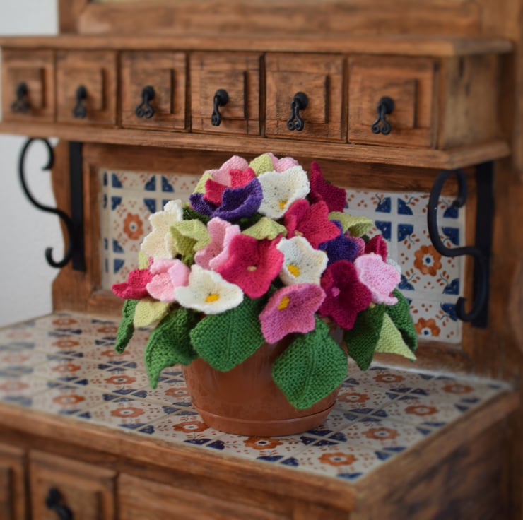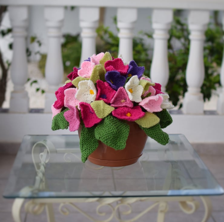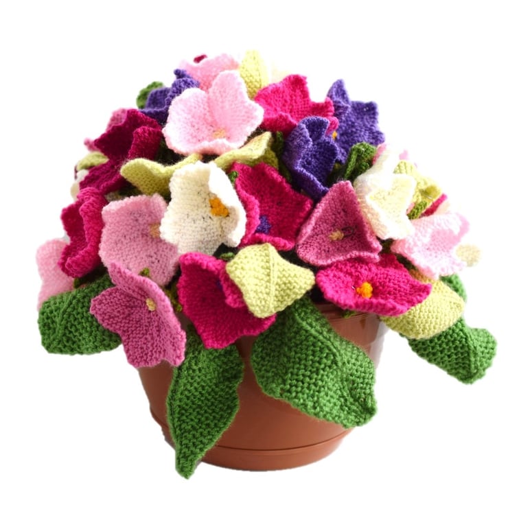 The pattern has instructions for knitting the flowers and leaves and how to wire them for the arrangement. This is a good pattern to use up all those lovely small quantities of yarn you have left over. I have filled a 20 cm (8 inches) diameter container, but you could use a smaller or larger one, just knit fewer or more flowers and leaves.
