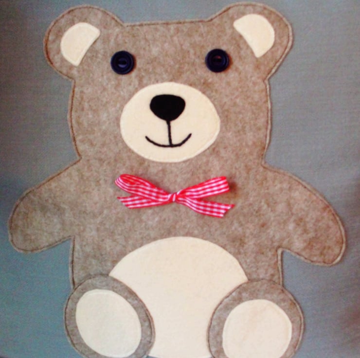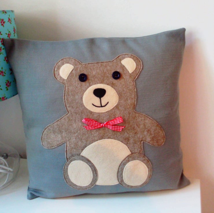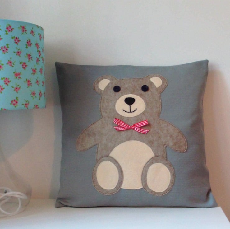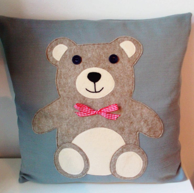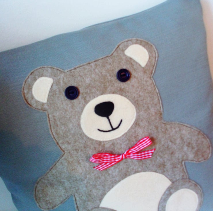 This lovely teddy cushion is made from linen with a felt teddy appliqued on, with button eyes and a bright red bow to finish.