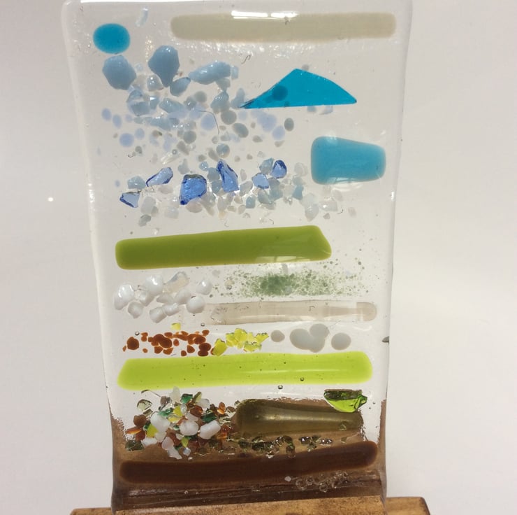 Fused glass panel, standing in a waxed wooden block. Created with several kiln firings to produce different textures that catch the light. Clear glass background with coloured frit added.