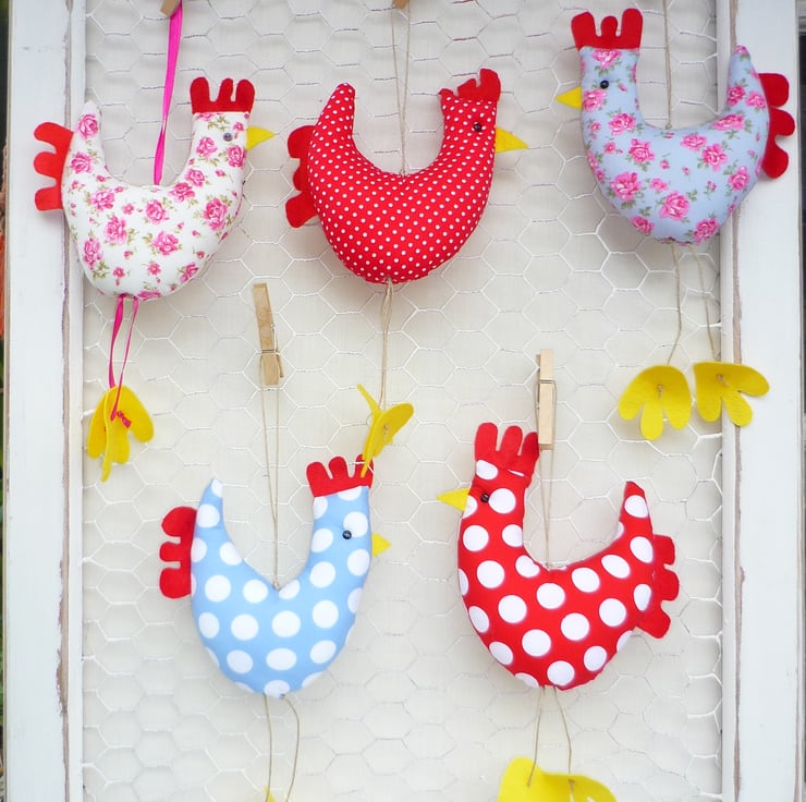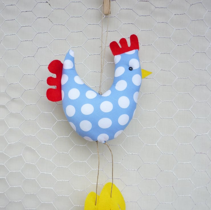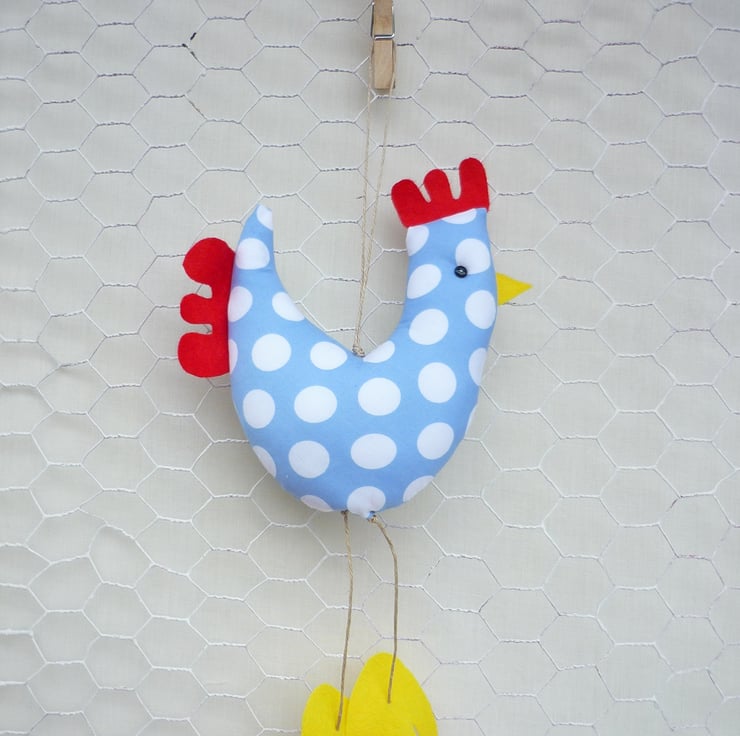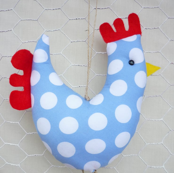This quirky hanging Chicken has been designed and handmade by myself from Blue and white polka dot fabric. She has long twine legs and buttons for eyes.
