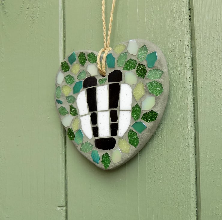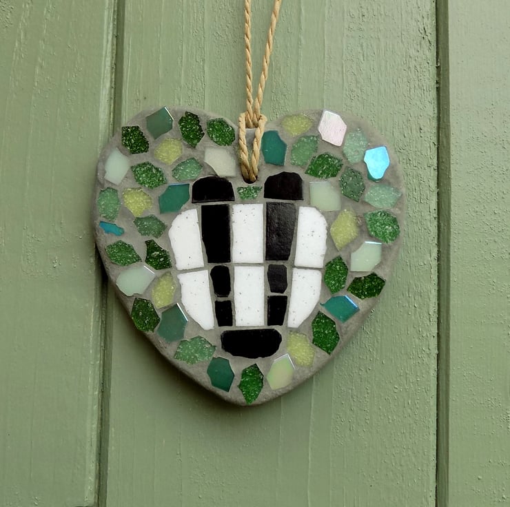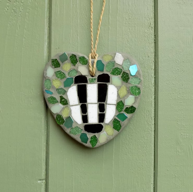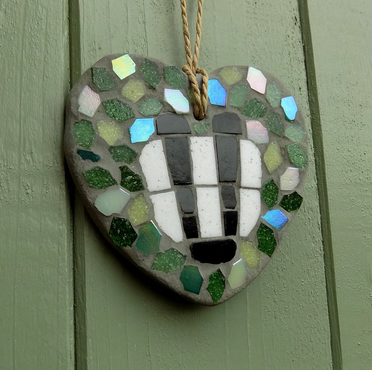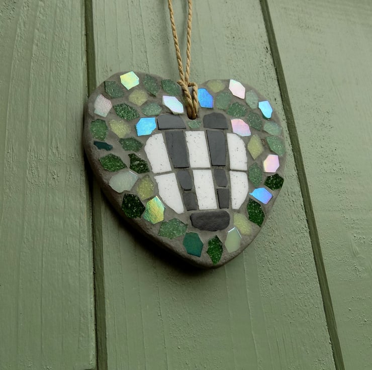 A small slate heart with a mosaic design of a badger, with a woodland background of various shades of green leaves, including dark jade and mint green iridescent leaves that shine with metallic gold, magenta and blue when the light catches them.