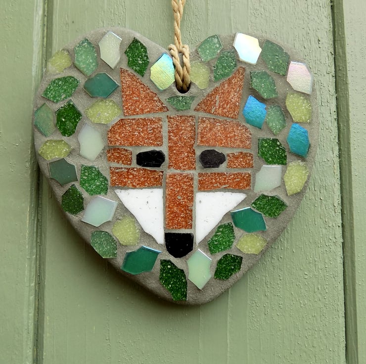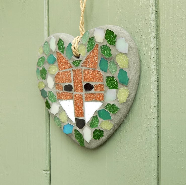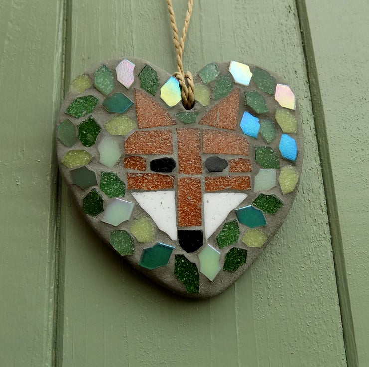 A small slate heart with a mosaic design of a fox, with a woodland background of various shades of green leaves, including dark jade and mint green iridescent leaves that shine with metallic gold, magenta and blue when the light catches them.