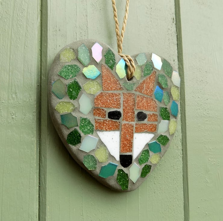 A slate base with a mosaic made with vitreous glass tiles and finished in a light grey grout designed to repel algae and mold. Size - 10cm x 10cm. Comes with a twine hanger.