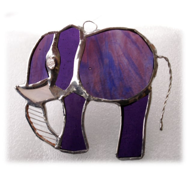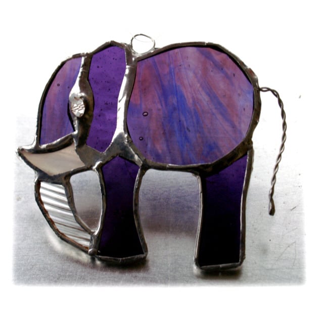 It is a little elephant in lovely shades and texture of purple glass, some streaked with blue