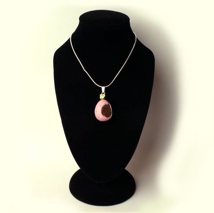 A cute faux mini egg with a cheeky bite out of it, handmade from polymer clay then hand painted and matt varnished to finish. It also has a handmade polymer clay bead with a daisy fixed in position above it, to add a touch of spring.