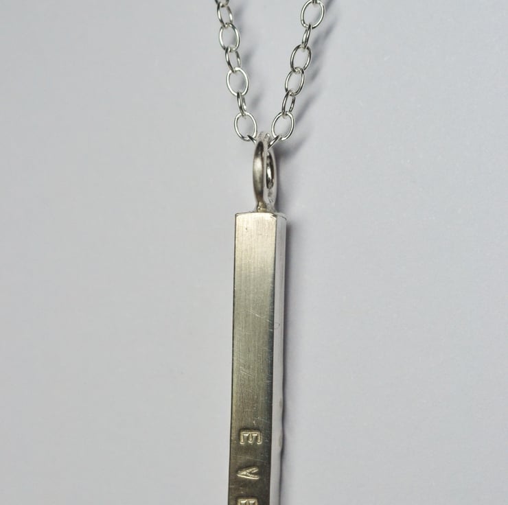 The bar is approx 25mm in length, and hangs from a sterling silver 16" trace chain.