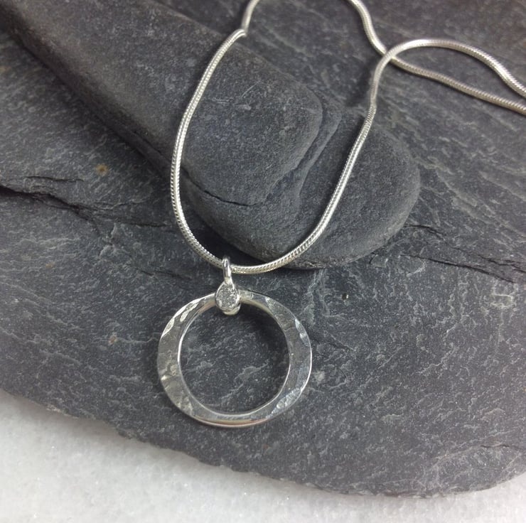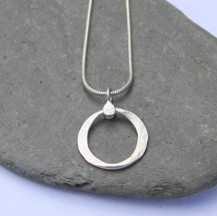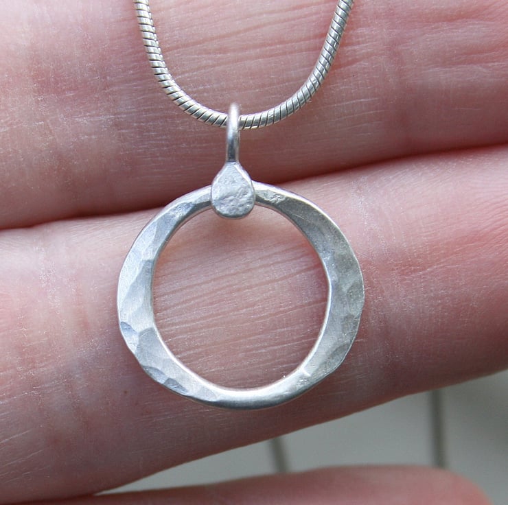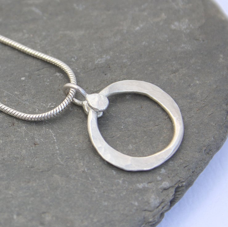 A small forged silver circular pendant that has been topped with handmade bail , it has been given a matt frosted finish.