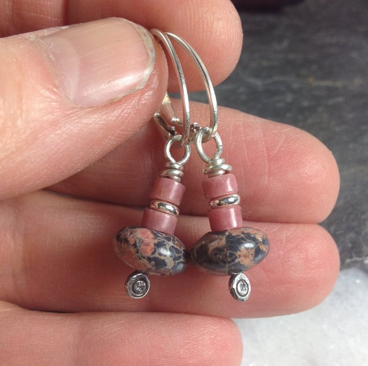 Leopardskin Jasper rondells and rhodochrosite heishi have been teamed with brightly polished silver to make these simple earrings.