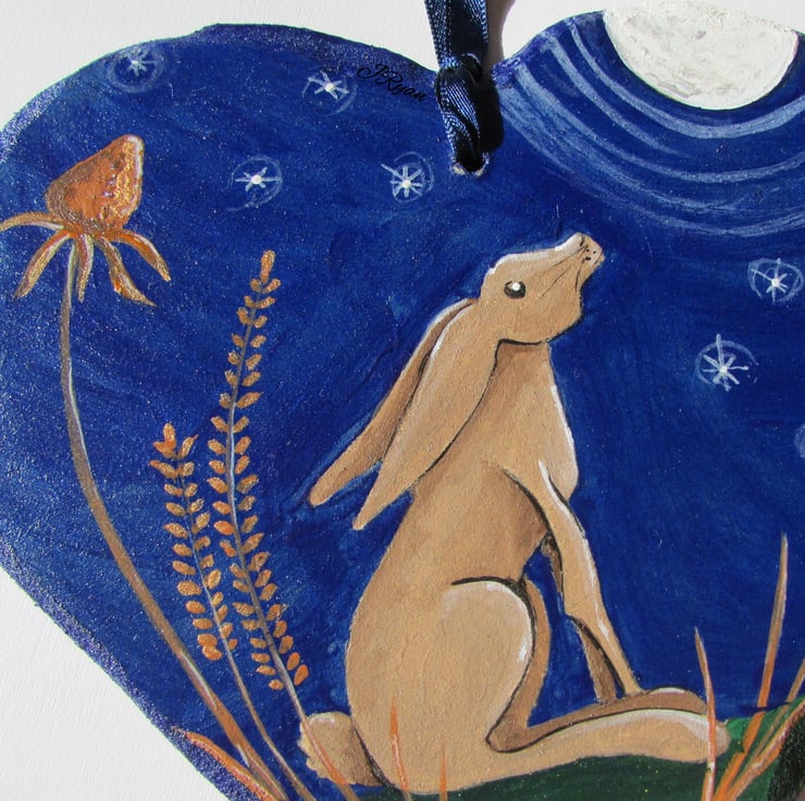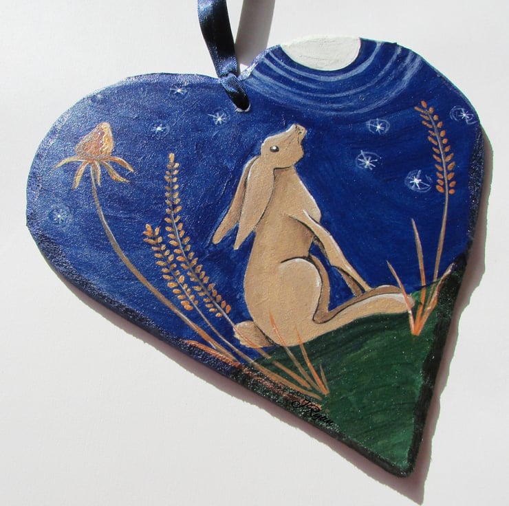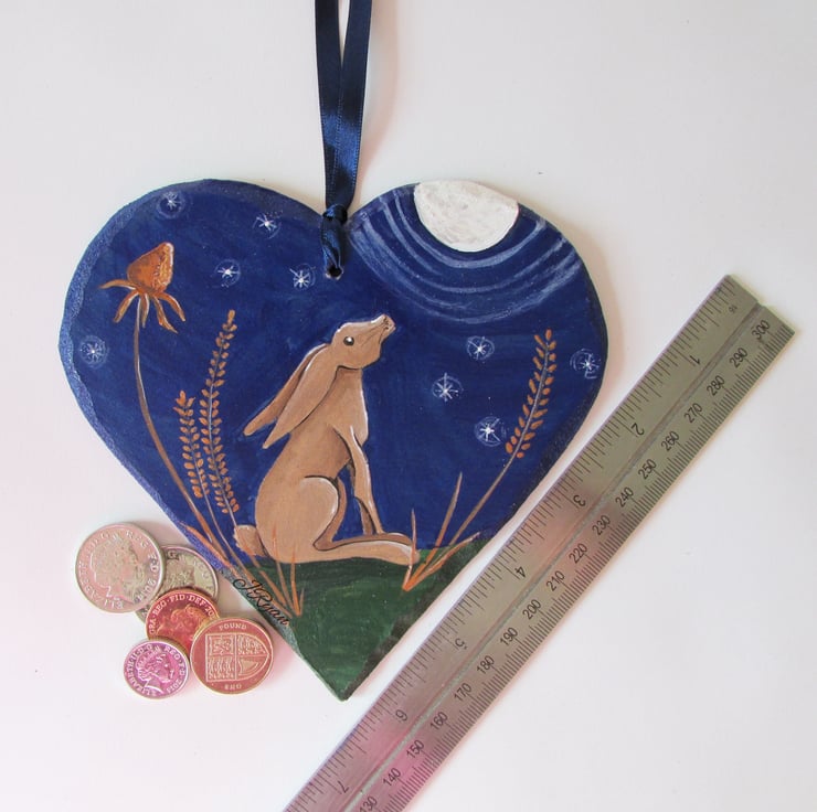 This large Heart is approximately 15cm x 15cm (6 x 6inches) and hangs from a matching ribbon, the back is signed and painted plain blue with a smidgen of shimmer.