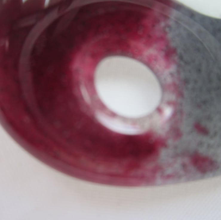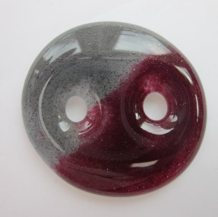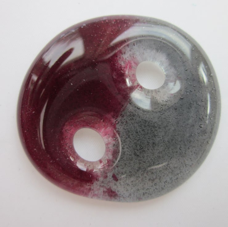 These buttons are made from transparent red and grey frit and are pleasantly wonky. They are approximately 3.5cm across. They will be perfect to fasten a bag or cardigan.