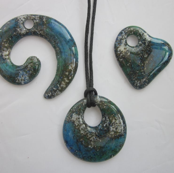This glass cabochon was fused by me. It was cast in a mould and then the glass was heated up to around 790 degrees celsius in a small glass fusing kiln and then it was then brought to annealing temperature to make it strong. It was then fire polished in the kiln to create the smooth surface. This whole process takes over 17 hours to complete.