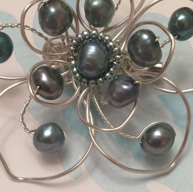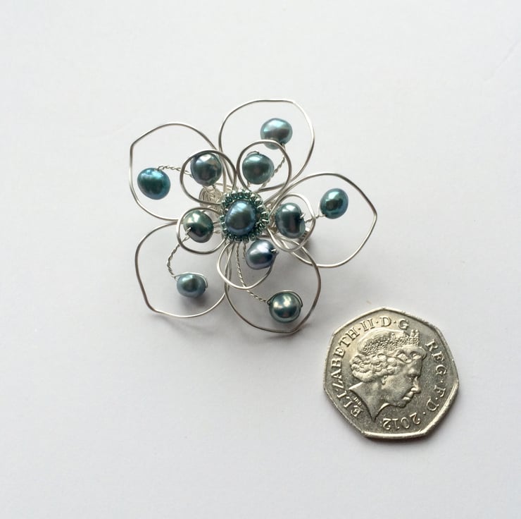I have formed silver plated wire into a double flower and added a beautiful teal freshwater pearl and tiny teal seed beads for the centre of the flower. More freshwater pearls have been twisted onto wire and added to the flower. The brooch pin is silver coloured with a safety catch