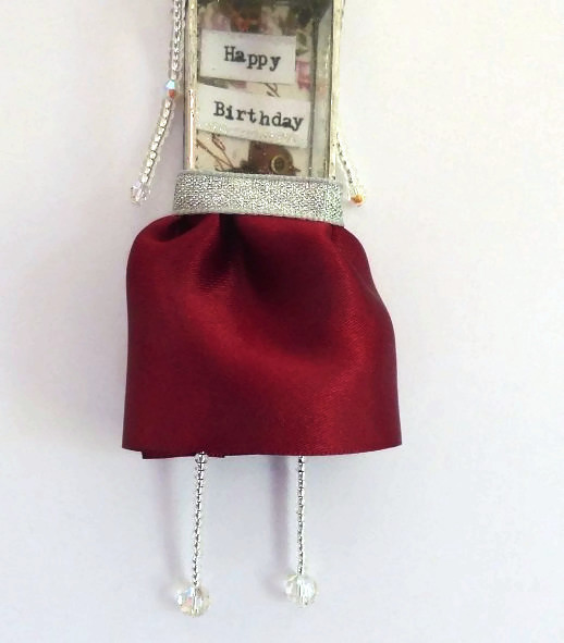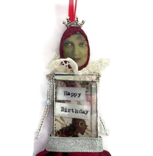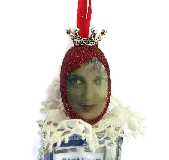 Her head not only has its own crown but it features a beautiful vintage face, surrounded by red glitter and a loop of ribbon at the top so she can hang up. She has a white lace ruffle and a red satin skirt made from ribbon. Here arms and legs move, and have been made with a mix of vintage beads, tiny seed beads and Swarovski beads.