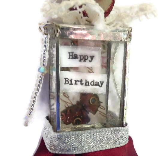 I have hand cut the glass to make her body, and hand soldered it together to house the Happy Birthday sentiment, The sentiment is placed in front of a summer themed shabby chic background of butterflies and flowers.