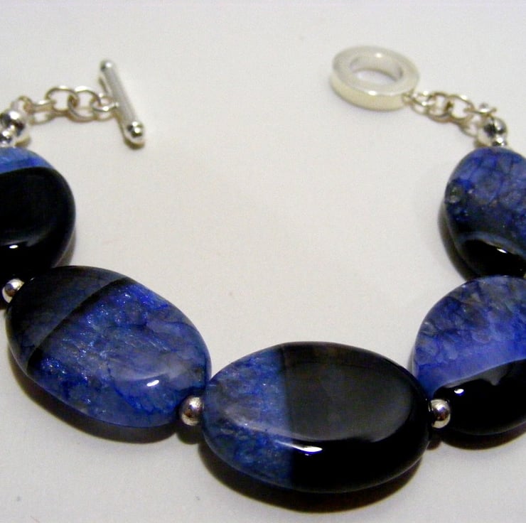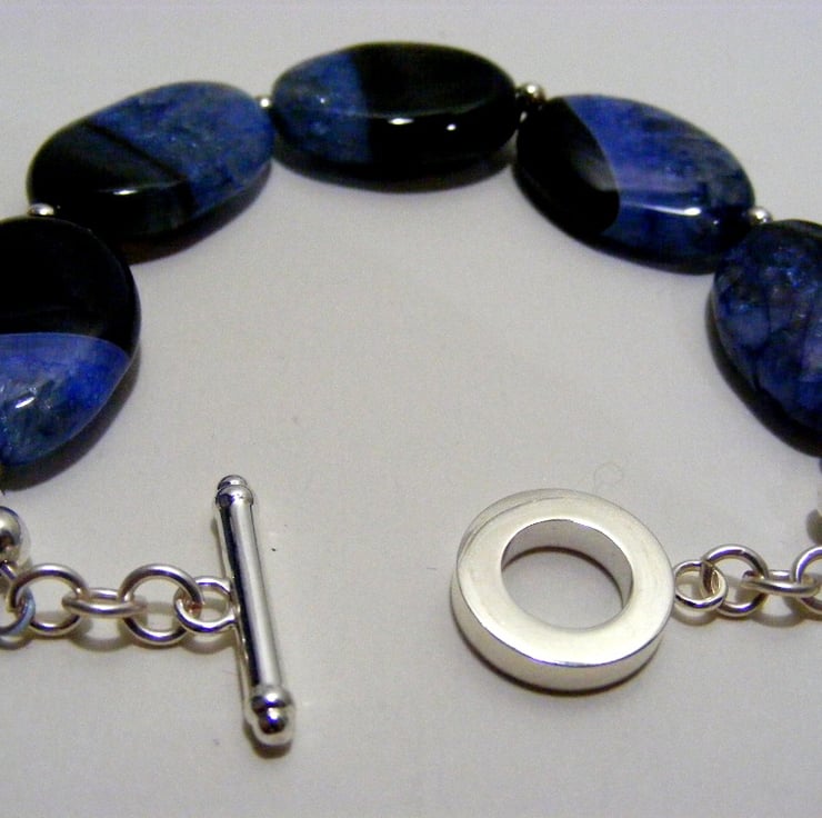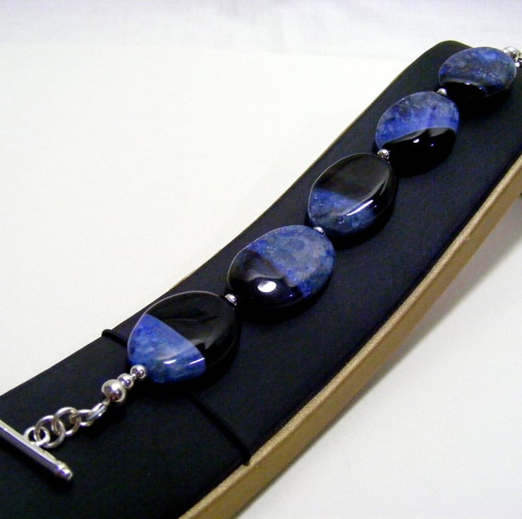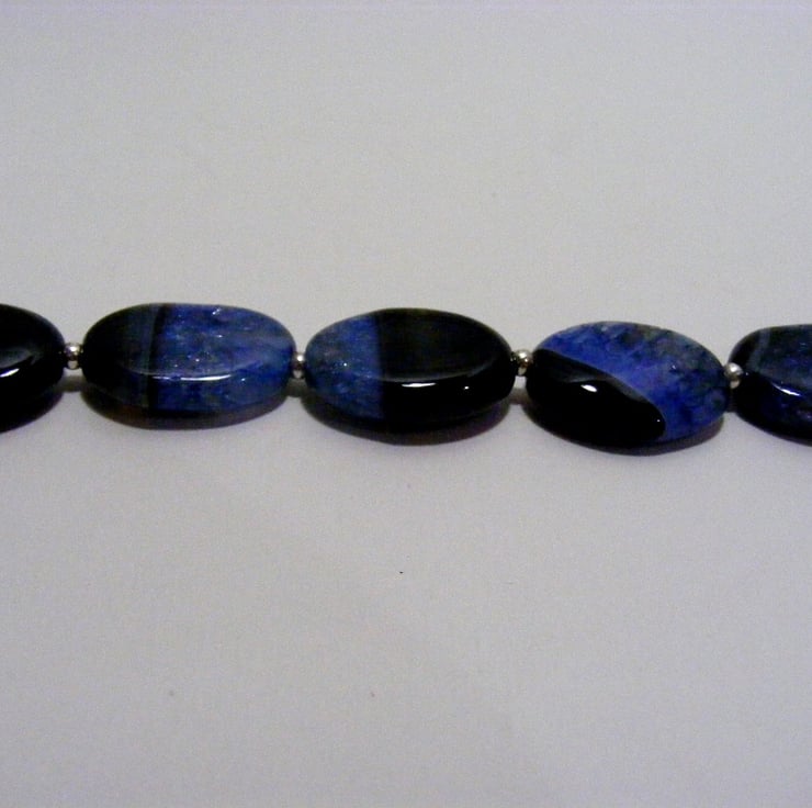 I have made this semi precious gemstone bracelet by threading 24 x 18 mm black agate with blue quartz puffy ovals and 2 mm silver plated spacers onto beading wire. Ends of the wire are finished with silver plated findings. I've attached a silver plated round toggle clasp to complete the bracelet.