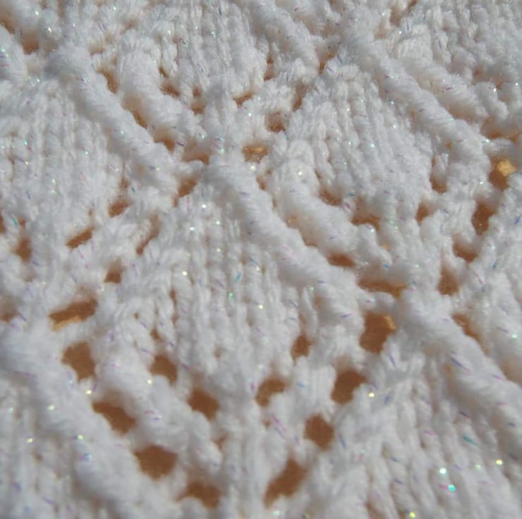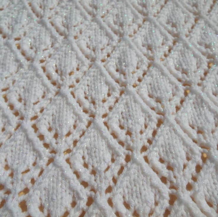 This shawl is on a made to order basis and can be done in a colour of your choice. It has an all over diamond eyelet pattern and has takes many, many hours to make but I enjoy every moment.