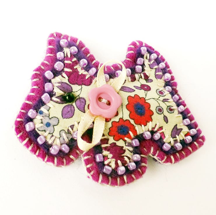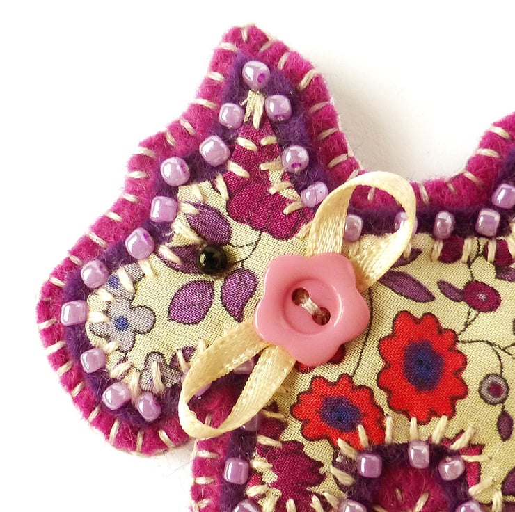 It features a little applique dog in floral Liberty of London print fabric. It has been mounted onto purple felt and edged with coordinating seed beads. It has been further mounted onto a pinky purple shade of felt and is finished with a ribbon and button detail. There is a metal brooch pin stitched to the reverse side for easy attachment.