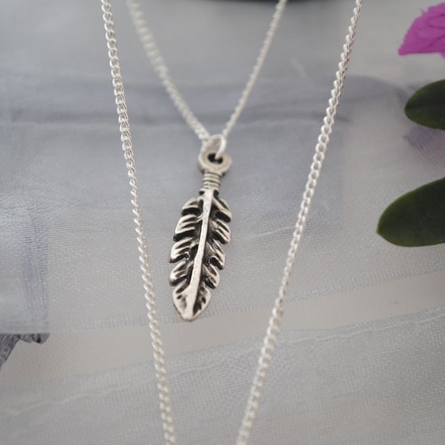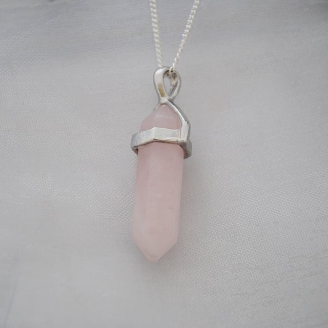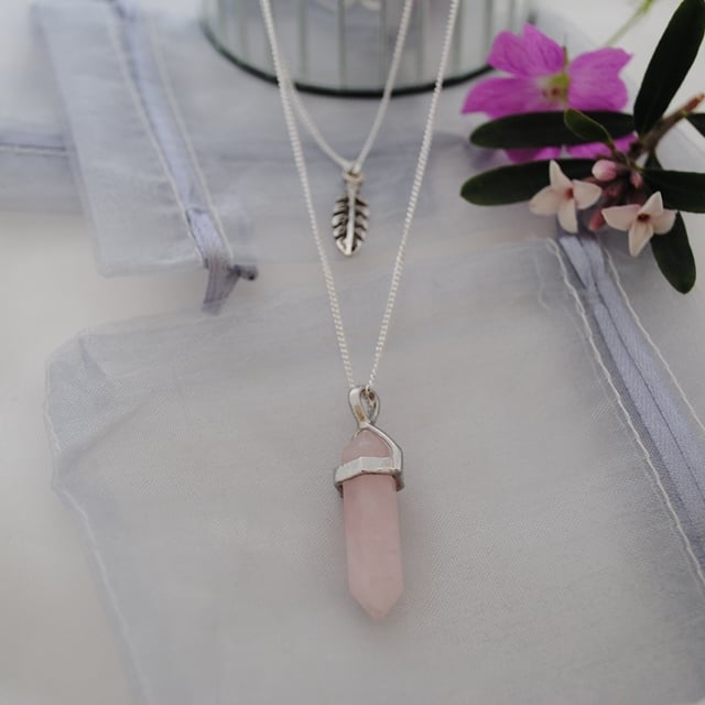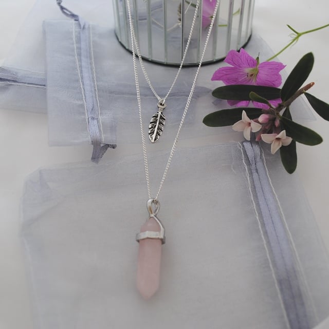 Rose quartz chakra pendant on the longer chain and a silver-plated leaf charm on the shorter length necklace.