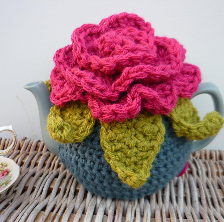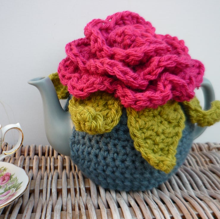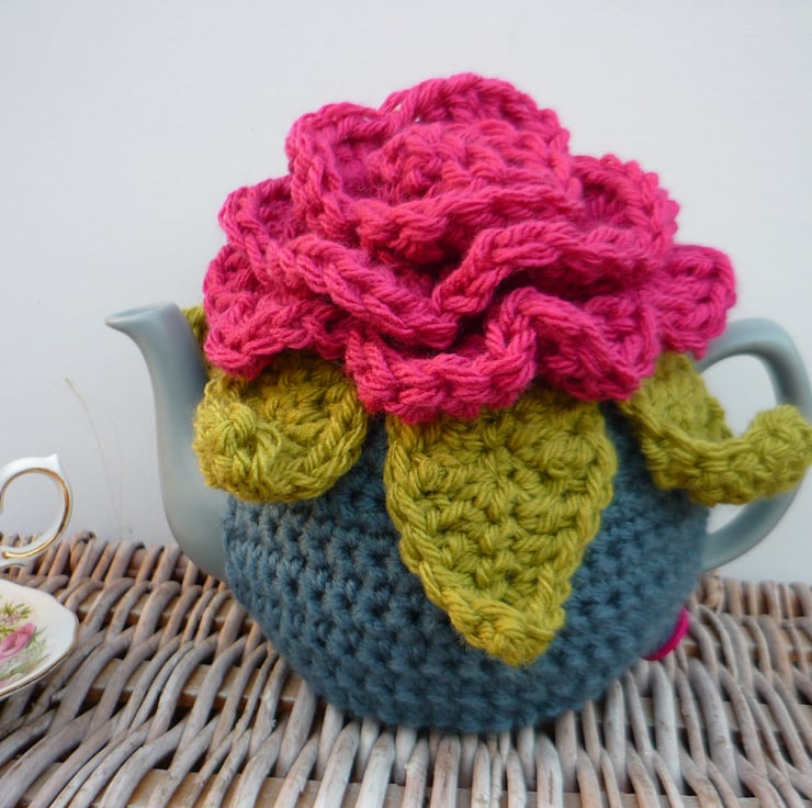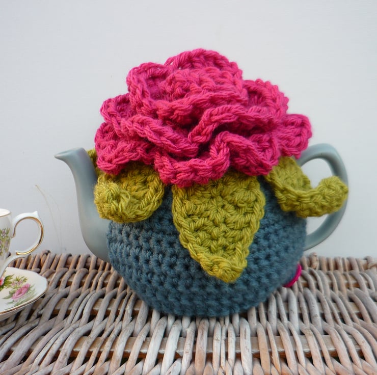 It is both pretty and practical blue cosy with green leaves and a pink flower. It would look great on a dresser for all to admire.