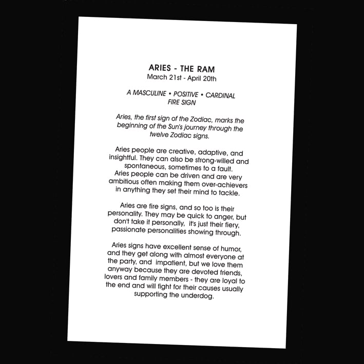 A5 8 page Aries Zodiac birthday card showing the aries symbol and star pattern.