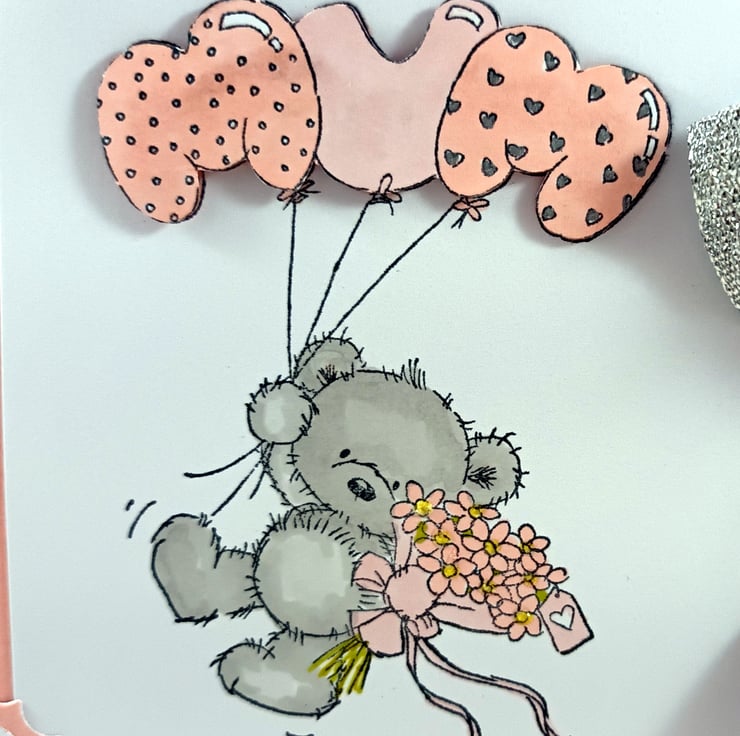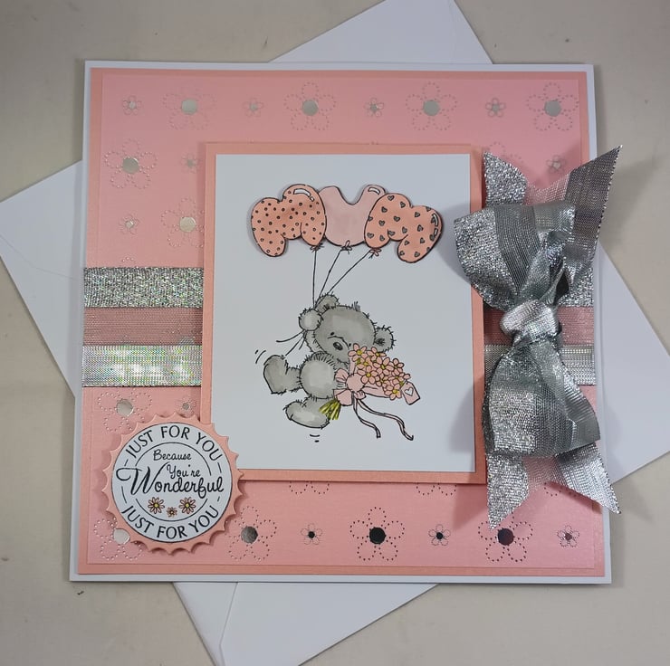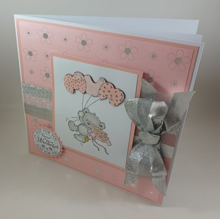 Large square card suitable for either Mum's birthday or Mother's Day. The card features a hand stamped and coloured image of a cute teddy bear with Mum balloons and a bouquet of flowers. The centres of the flowers have been glittered. The image is layered onto pretty silver and pink floral paper with a silver ribbon and bow finishing the card.