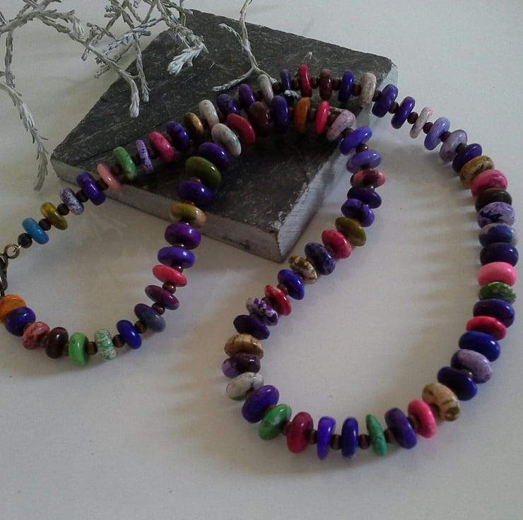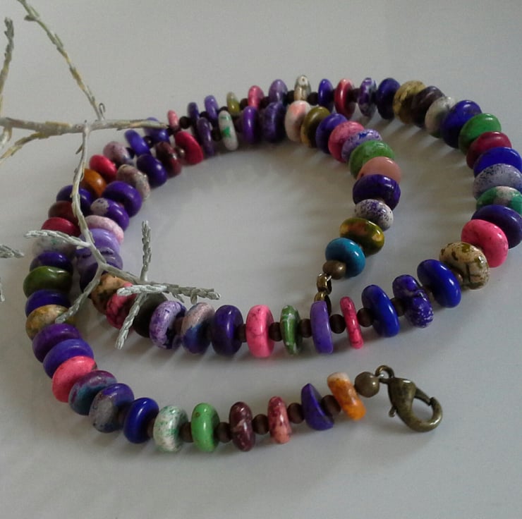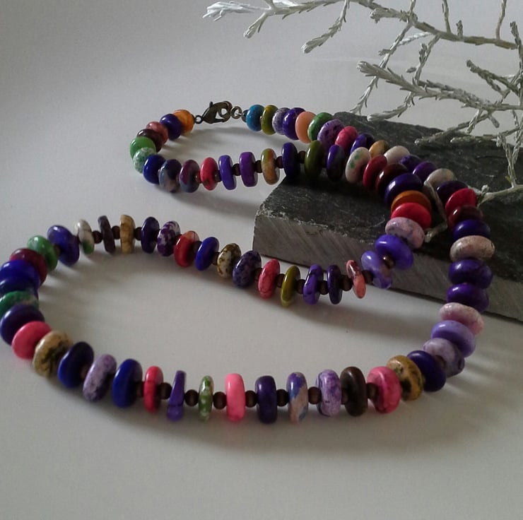 This simple tribal looking necklace has been designed to be worn by either sex. The necklace has been made from small magnesite coined shaped magnesite gemstone beads with antique finish nickle free copper spacer beads between each one, finished off with a matching bolt ring style clasp.
