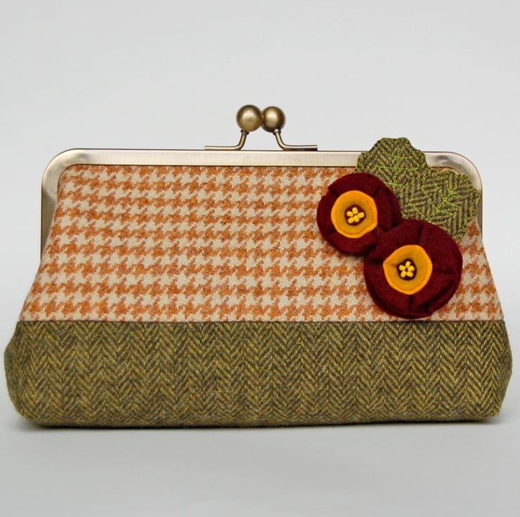 Wool tweed purse with an antiqued brass colour clip frame.