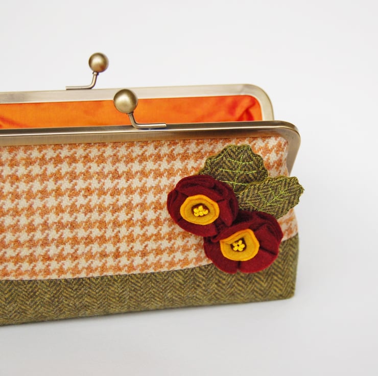 I first made this colour version of the tweed purse as a gift for my Sister. I especially like the 'pop' of the orange silk lining and the Auricula Brooches are always popular.
