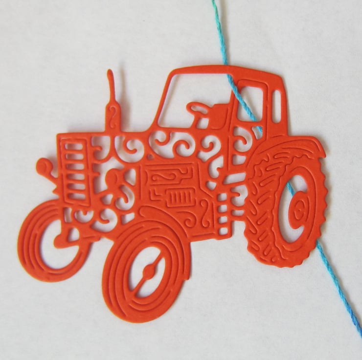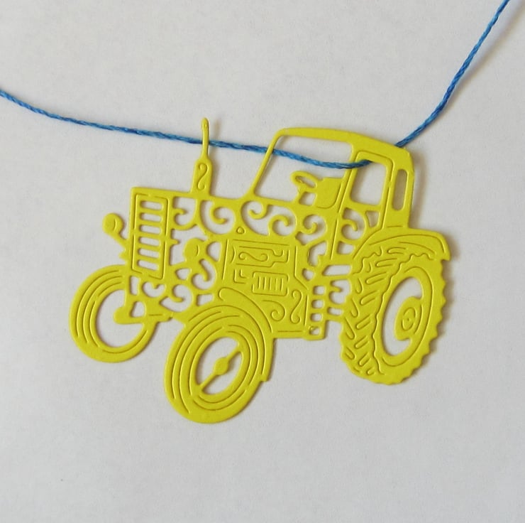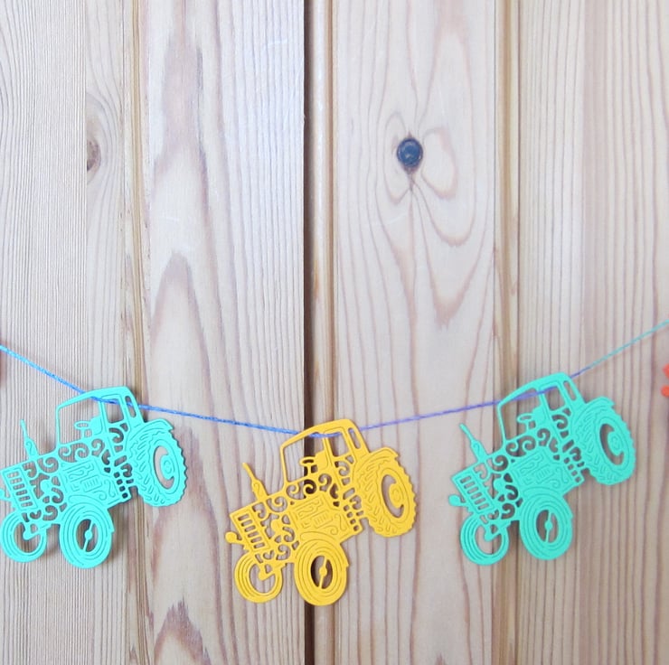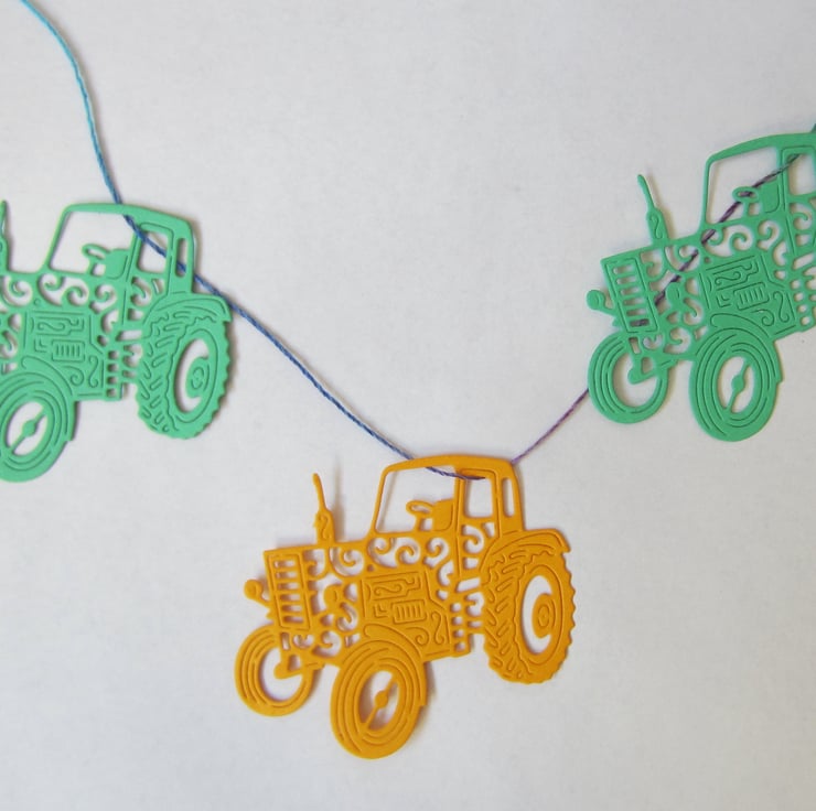 Card tractor bunting in lovely bright colours. 7 tractors strung on a multi coloured thread. Each tractor measures 7.5 x 6.5 cm. The whole string is about 1.5 metres and there is a loop at each end for hanging.