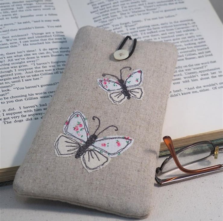 This beautiful handmade glasses case is made from Linen fabric with a floral cotton lining. The case is padded to give your glasses some protection and has a loop and button fastening.