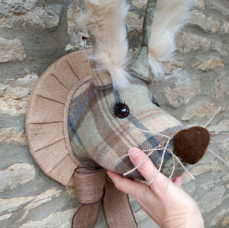 Handmade in a gorgeous green tweed fabric, extra long ears with plush cream faux fur, large brown eyes with eyelashes, hessian whiskers and finished with a brown needle felted heart nose.