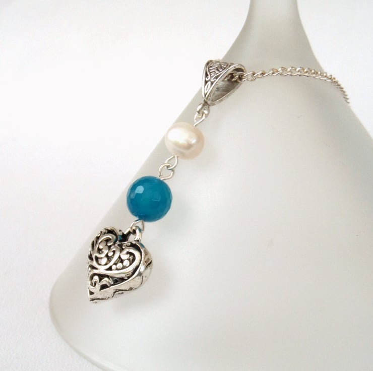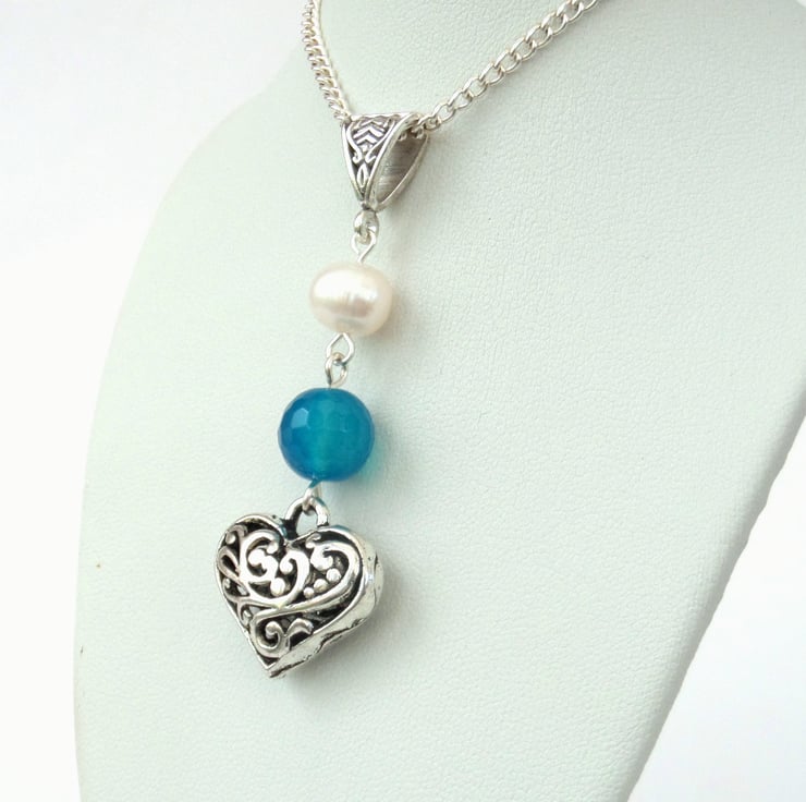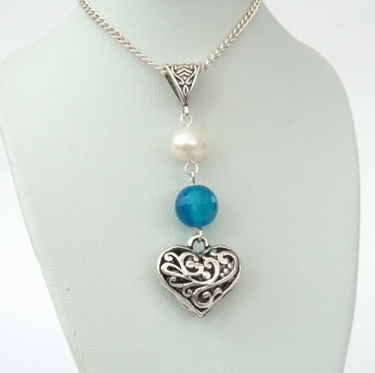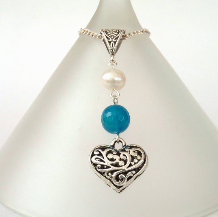 A great combination of stunning blue agate, pearl and tibetan silver heart charm